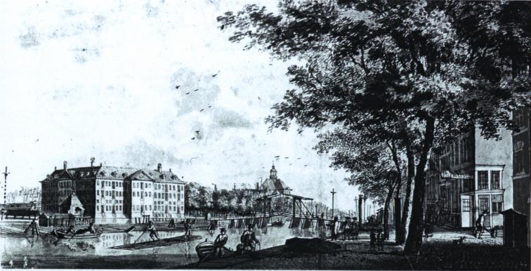 Het Admiraliteits gebouw in the 18de eeuw, met rechts de buitenkant van Jacob's bakkerij.